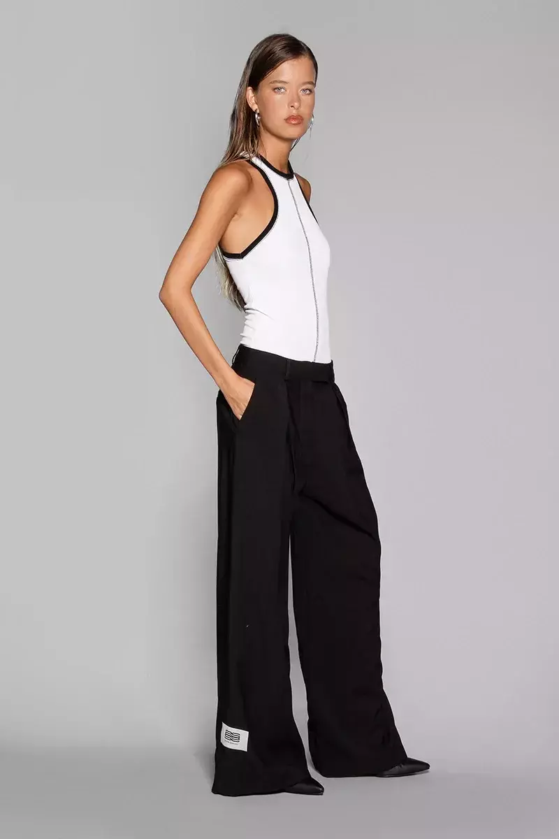 Pantalón sastrero Exo negro de tela rígida, con pierna larga y amplia. Detalle de etiqueta tejida en la pierna derecha y bordado SS a tono en la espalda, aportando un toque de identidad y exclusividad.
